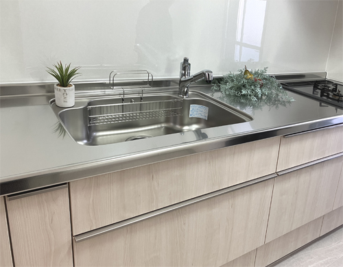 工事中はご協力ありがとうございました。キッチンはリクシルの「シエラS」をおすすめいたしました。ナチュラルな木目調の扉とスリム取手のキッチンは、シンプルでスタイリッシュなデザインで、どんなインテリアにも馴染みます。スキットシンクは、シンクの中のお手入れもシンクまわりの片付けも、スキッとはかどるシンク。シンク内の大きなポケットも広く使いやすいポイントです。